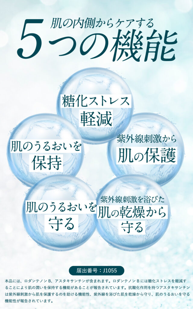 【届出表示】本品にはロダンテノンB、アスタキサンチンが含まれます。ロダンテノンBには、糖化ストレスを軽減することにより肌の潤いを保持する機能があることが報告されています。抗酸化作用を持つアスタキサンチンは、紫外線刺激から肌を保護するのを助ける機能性、紫外線を浴びた肌を乾燥から守り、肌のうるおいを守る機能性が報告されています。