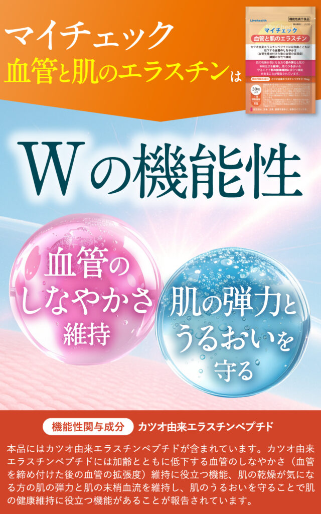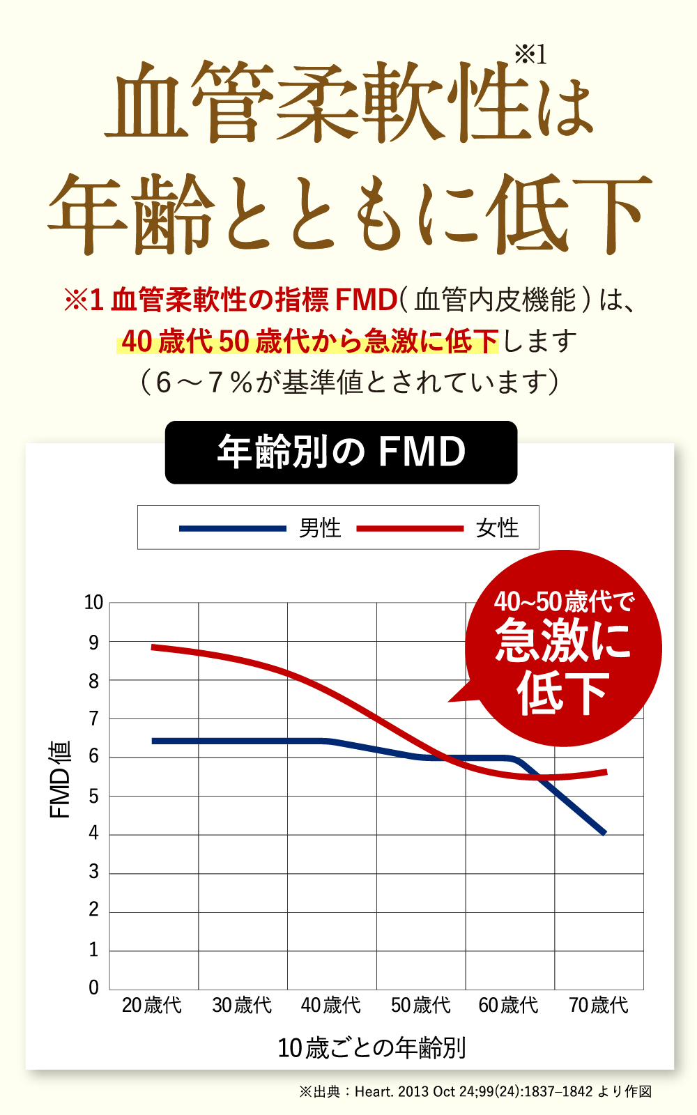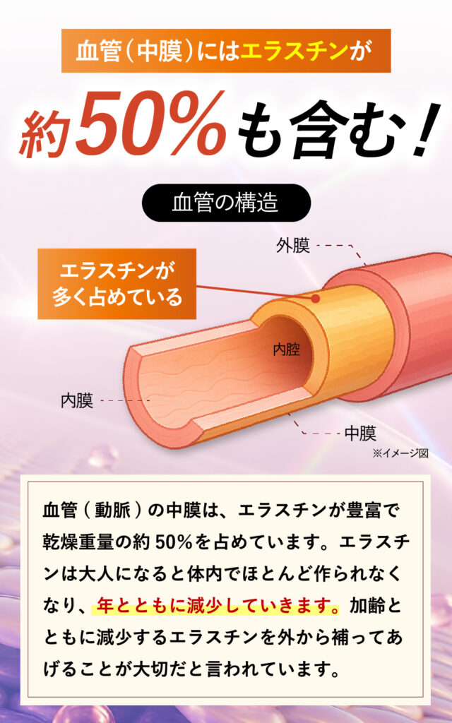 加齢とともに低下する血管のしなやかさの指標(FMD変化率)がエラスチン摂取12週間で有意に改善したことが報告されています。