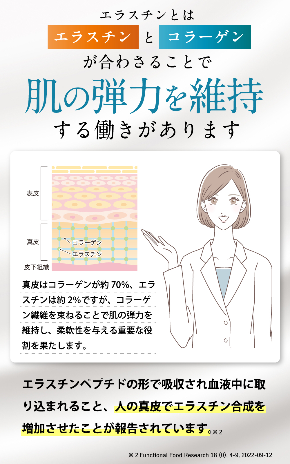 タンパク質の一種で、皮膚、血管、靱帯など、伸縮性が必要とされる組織に多く分布し、弾性を与える働きをしています。エラスチンが分解されて分子量が小さくなったものがエラスチンペプチドです。